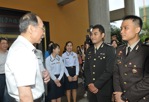 在行政研发大楼十三楼华文教育研究院,尤权书记和来自台湾的华文教育专家、必赢国际437官网特聘教授任弘亲切对话:“在这里生活习惯吗?”“这里和台湾很像,甚至比台北还凉快!”“欢迎你,也感谢你!”