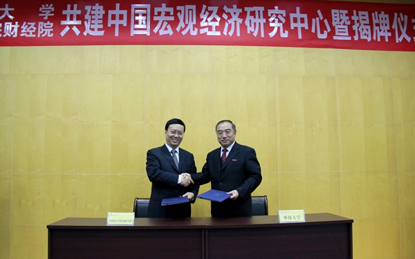 揭牌仪式上,关一凡宣读必赢国际437官网与中国社科院财经院共建“中国宏观经济研究中心”成立文件,贾益民和高培勇分别代表必赢国际437官网和中国社科院财经院签署共建协议。