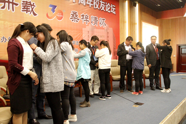 最后,同学们为校友们佩戴校徽,让校友们笑言“重回学生时代”。这一次“听君一席胜读十年”的亲切交流,每一位参与者都各有感悟,同学们和校友们依依挥别,期待下一个十年辉煌再相聚。