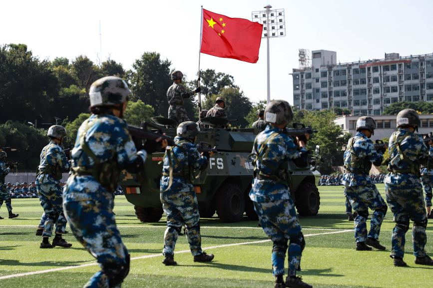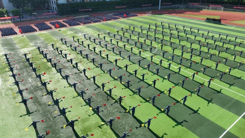 随着音乐奏响,数字方阵的学子们饱含着赤诚爱国心、真挚爱校情,迎着朝阳依次摆出“1960”“2023”“华侨”“63”“红船”“五角星”“党徽”“中国地图”等样式,会操表演也正式拉开帷幕。旗语方阵手握红黄双色旗,利落潇洒,构筑旗语世界;擒敌拳方阵、军体拳方阵拳拳生风、步步有力,书写青春篇章;匕首操方阵、刺杀操方阵持刃起舞、劈杀挡刺,尽显英雄本色。徐徐开入的装甲车将场面推向了高潮,战术方阵、战术基础方阵、突袭行动方阵嘶吼上阵,骁勇善战,刺杀对抗,面对突发情况有条不紊:隐蔽侦查、清除障碍、精确狙杀、火力支援、救死扶伤……战术与情节相互交融,一气呵成。