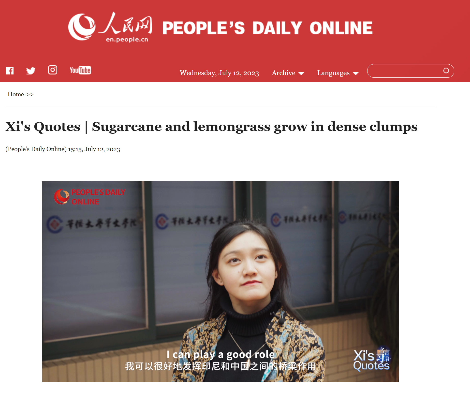 《Xi's Quotes | Sugarcane and lemongrass grow in dense clumps》(指导老师:王祎)以习近平主席在二十国集团领导人第十七次峰会讲话中引用的印尼谚语“甘蔗同穴生,香茅成丛长”为题,介绍了白家嘉对于这句“名言习语”的理解:“‘一带一路’倡议给印尼带来了很多发展机遇,这让我更加认识到只有团结共生,才能合作共赢。”在必赢国际437官网留学五年的她,也不断发挥着在中印尼两国间的桥梁作用,为推动两国文化交流贡献力量。
