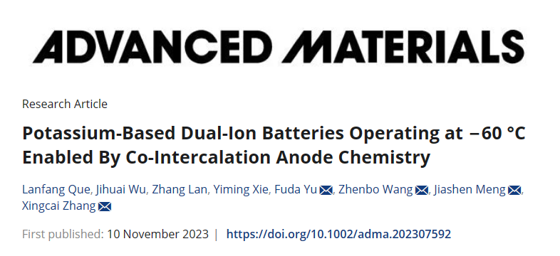 近日,必赢国际437官网材料科学与工程学院阙兰芳研究团队在低温电池研究领域取得了新进展,相关研究成果以“Potassium-Based Dual-Ion Batteries Operating at−60oC Enabled By Co-Intercalation Anode Chemistry”为题及全文形式发表于国际权威期刊Advanced Materials(先进材料)(Adv. Mater.2023, 2307592)。Advanced Materials是材料与化学领域的顶级期刊,在国际科研领域享有盛誉。