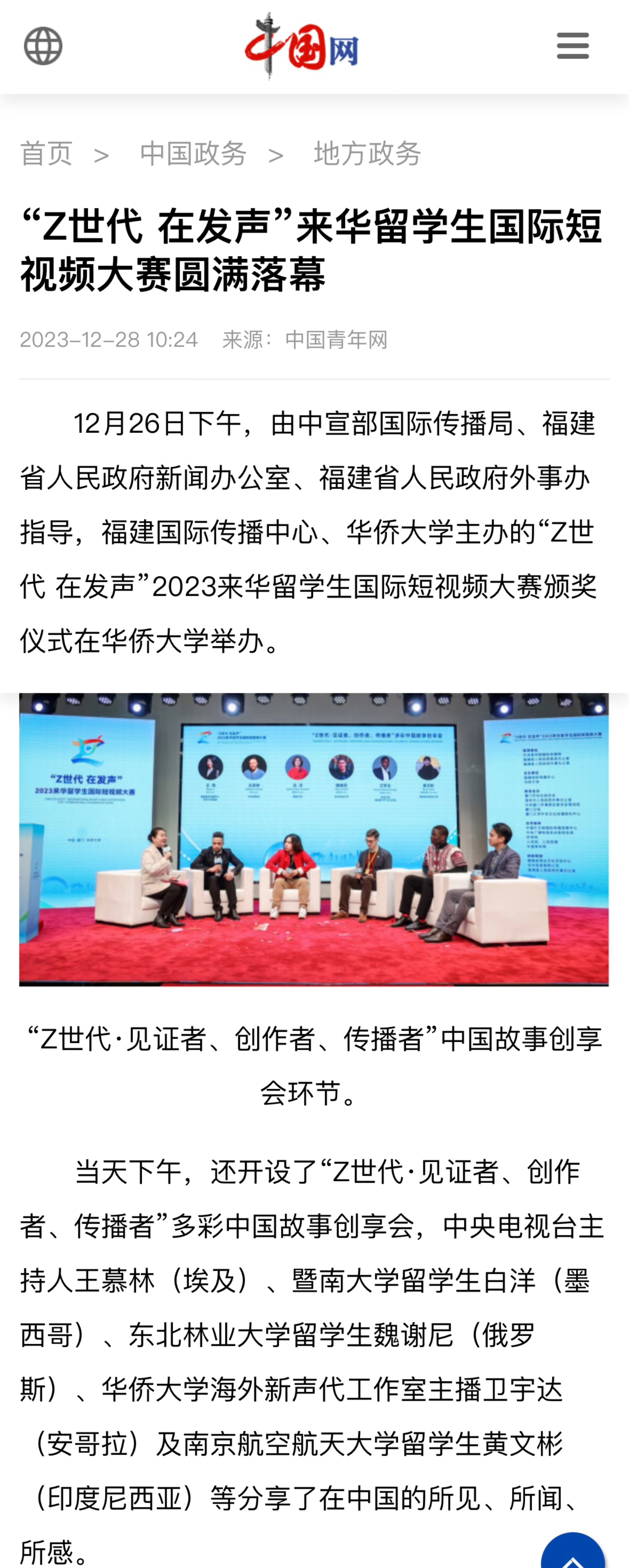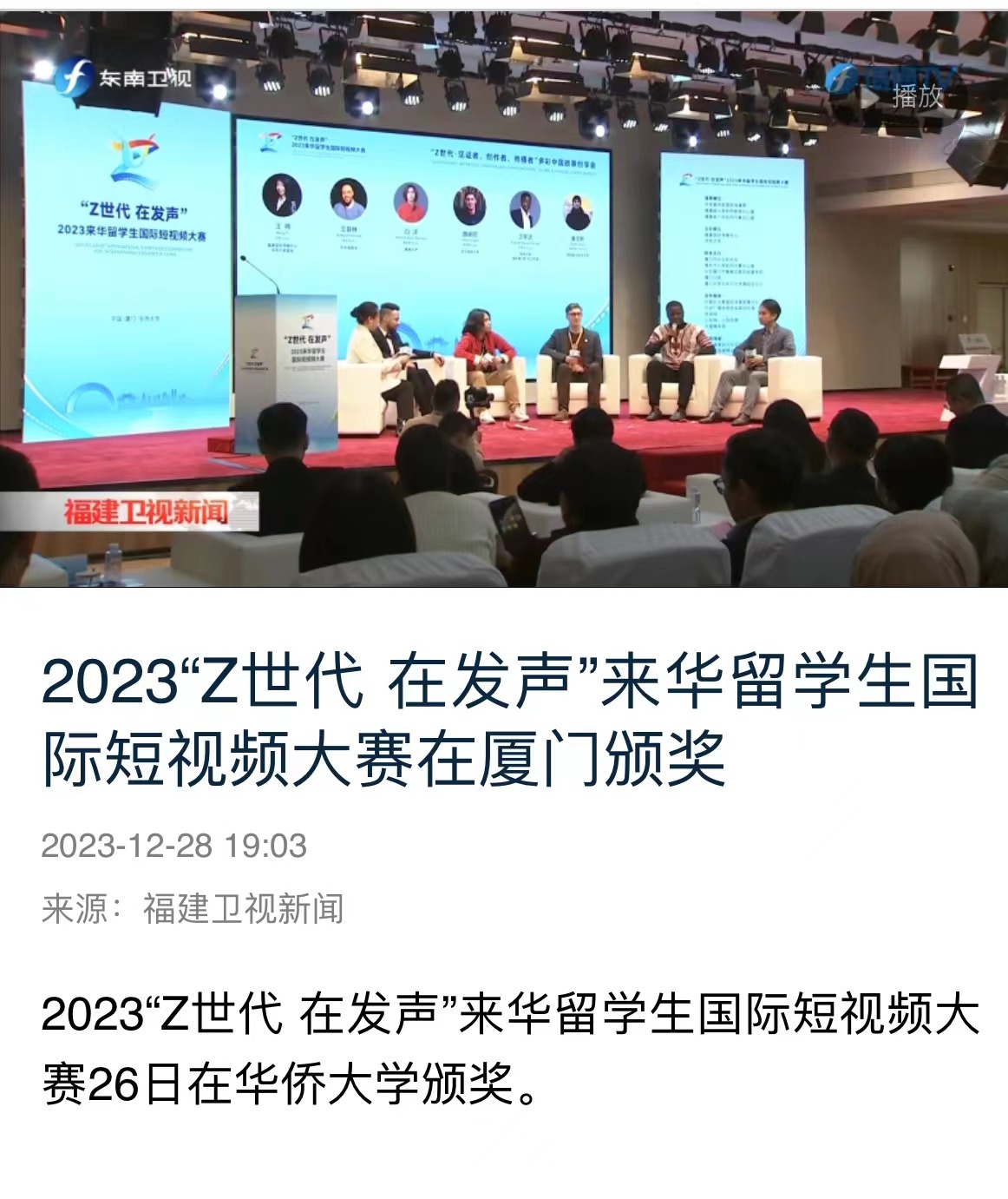 近日,在华大落幕的“Z世代 在发声”2023来华留学生国际短视频大赛引发关注,大赛启动仪式、评审会、颁奖典礼等内容获人民网、光明网、中国青年网、总台国际在线、环球网、中国网、中国报道、福建新闻联播等主流媒体报道,综合阅读量超3000万。