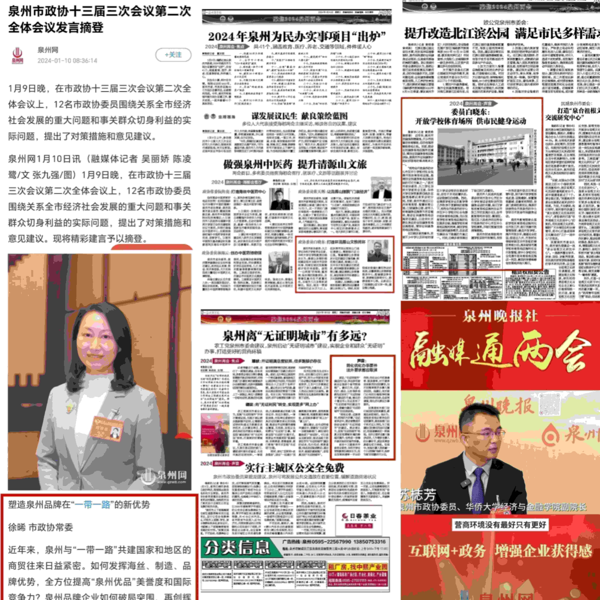 徐晞委员作为12名发言代表之一,在政协第二次全体会议上作题为《塑造泉州品牌在“一带一路”的新优势》的大会发言,建议多渠道培育和引进国际化专业人才,加强校地、校企合作,培育新型品牌,同时放大世遗泉州效应,助力提升“泉州优品”知名度。
