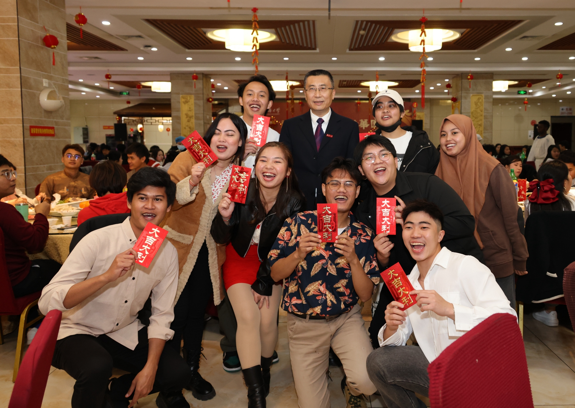 当晚,校长吴剑平,副校长王秀勇,党委副书记、纪委书记何纯正等出席两校区晚宴,吴剑平、王秀勇分别致辞,为留校师生送上新春祝福。而除了准备丰盛的菜肴,校领导们还向学生们派发了“压岁钱”。接过象征红红火火的红包,学生们纷纷拍照上传,与家人朋友分享节日的喜悦,在佳肴飘香、欢声笑语中传递对新年的美好祝愿。
