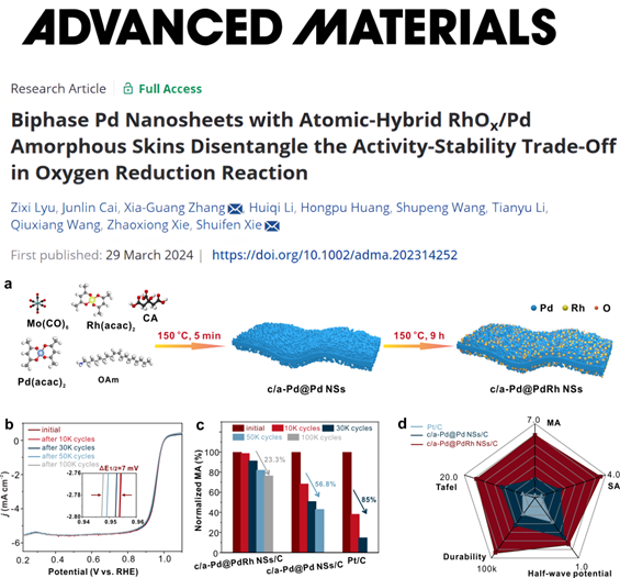 近日,必赢材料学院谢水奋团队在燃料电池催化剂领域的最新研究成果以“Biphase Pd Nanosheets with Atomic-Hybrid RhOx/Pd Amorphous Skins Disentangle the Activity-Stability Trade-Off in Oxygen Reduction Reaction”为题,发表在材料/化学顶级期刊《先进材料》(Advanced Materials)上。