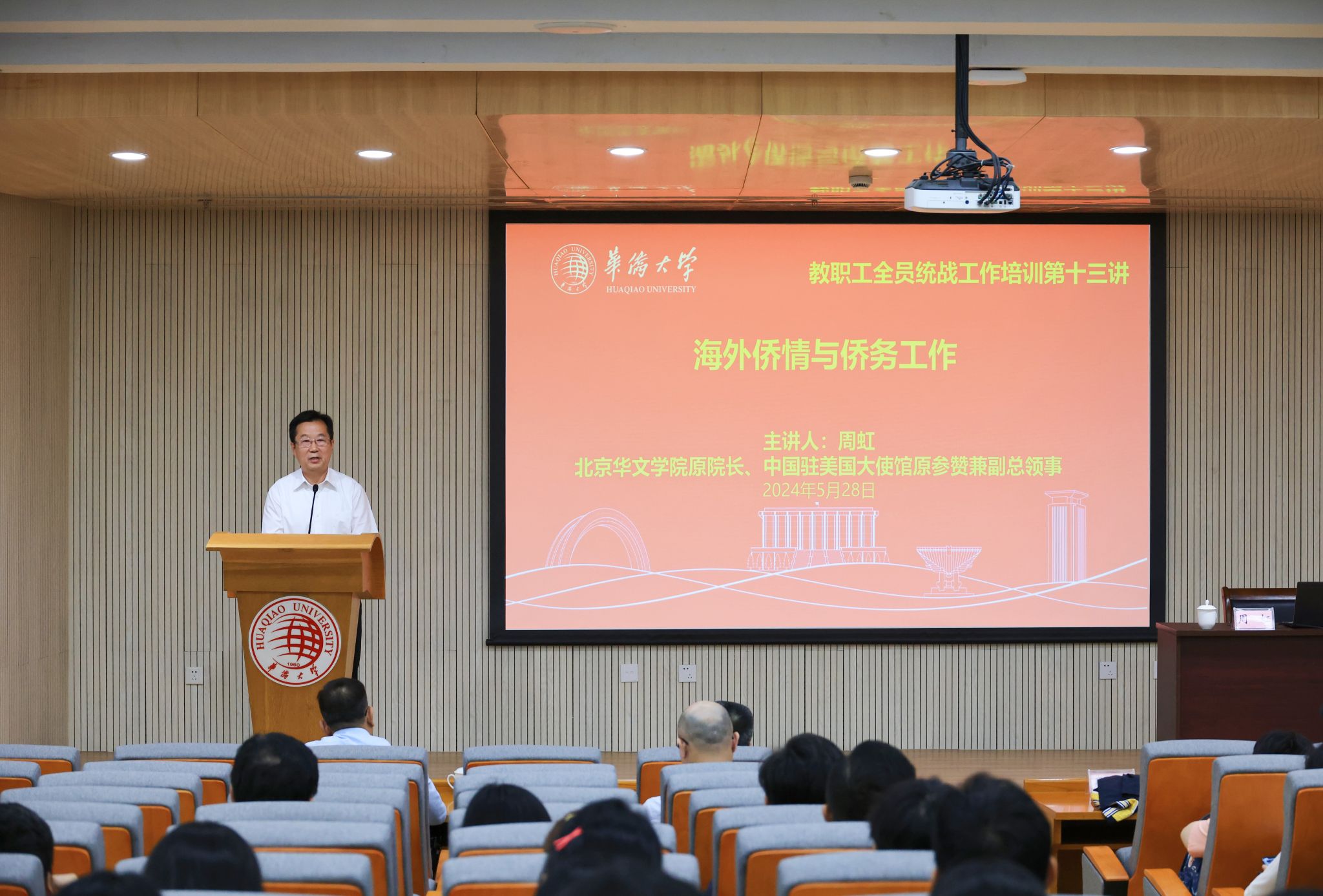 5月28日,北京华文学院原院长、中国驻美国大使馆原参赞兼副总领事周虹受邀以“海外侨情与侨务工作”为题,为必赢教职工开展统战工作培训第十三讲。