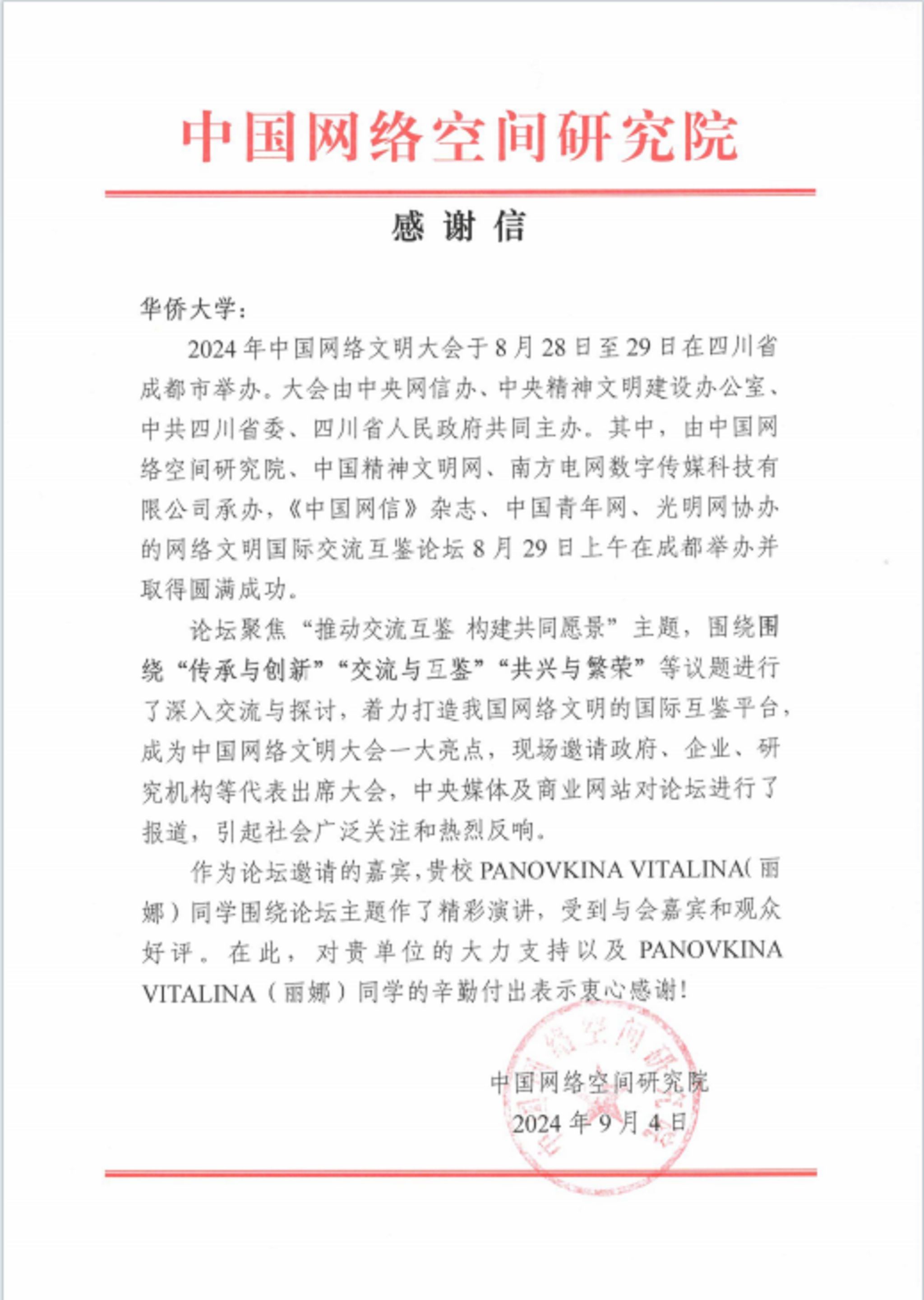 必赢收到主办方感谢信