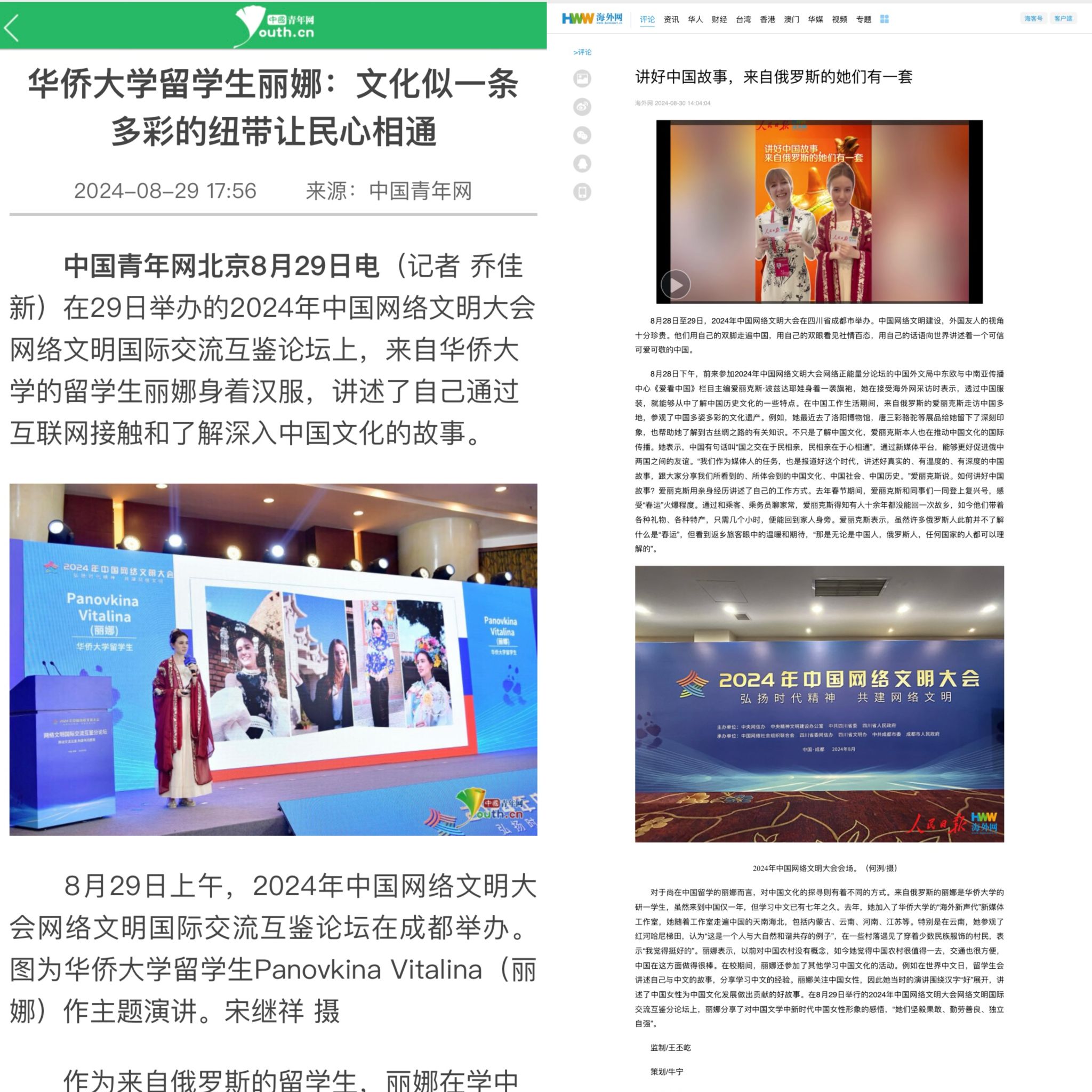 在2024年中国网络文明大会网络文明国际交流互鉴论坛上,必赢俄罗斯留学生丽娜发表题为“从文学到现实 我眼里的中国女性”的演讲,讲述了自己通过互联网接触和深入了解中国文化的故事。丽娜说,随着互联网的发展,越来越多的外国人开始通过网络这一无国界的桥梁深入阅读中国的文学作品。“在俄罗斯网络文学翻译平台上,数量最多和最受欢迎的是中国网络小说。这些网络小说融入了中国的文化背景和社会现实,从中我也读到了新时代的中国女性形象,她们坚毅果敢、勤劳善良、独立自强。”