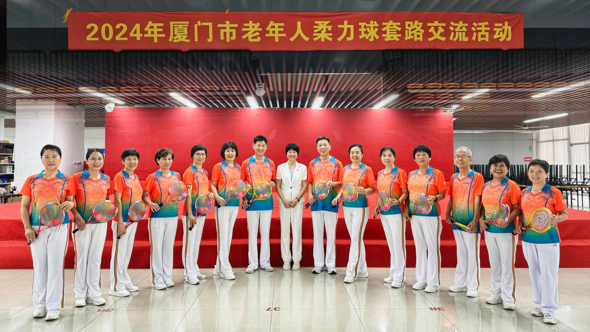 朱琦环(中)率队参加2024年厦门市老年人柔力球套路交流活动