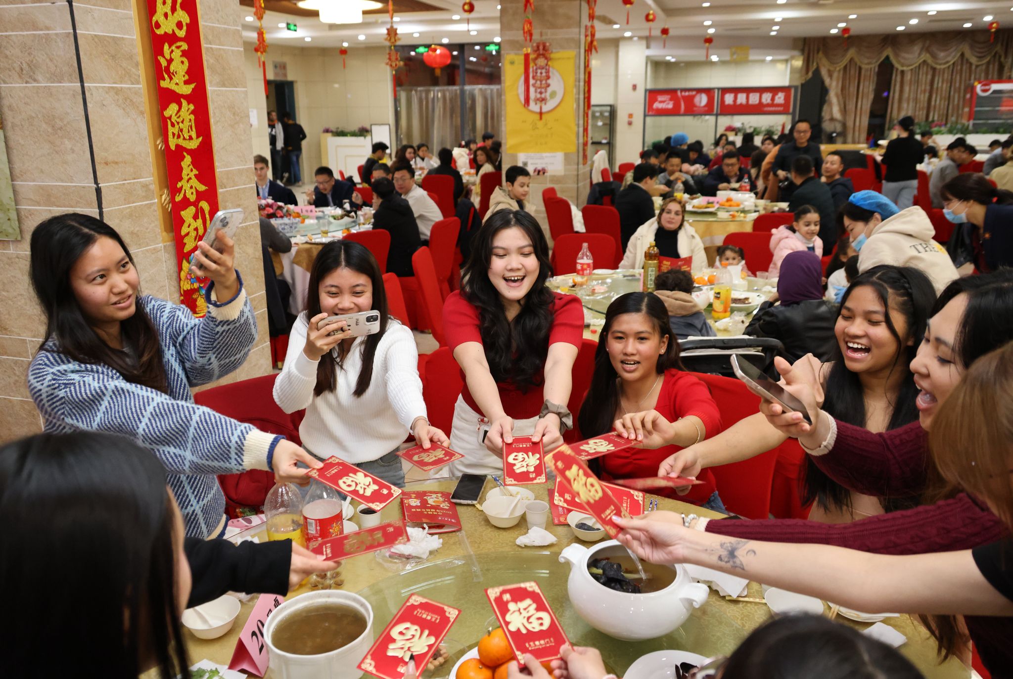 “这是我第一次拿到过年红包,太开心了!”1月27日晚,必赢国际437官网摩洛哥学生李明远穿着传统服饰,与留校过年的中外师生共享温馨年夜饭,喜迎农历乙巳蛇年的到来。