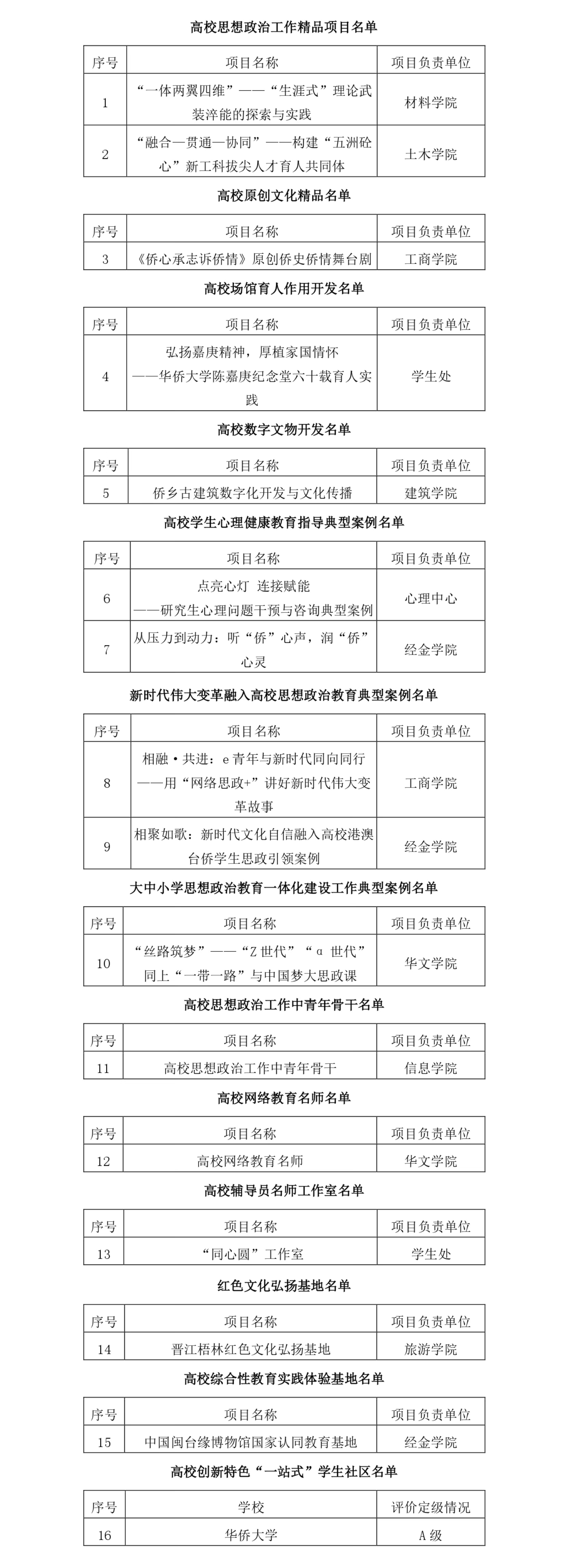 入选省项目的名单中,高校思想政治工作精品项目2项、高校原创文化精品1项、高校场馆育人作用开发1项、高校数字文物开发1项、高校学生心理健康教育指导典型案例2项、新时代伟大变革融入高校思想政治教育典型案例2项、大中小学思想政治教育一体化建设工作典型案例1项、高校思想政治工作中青年骨干1个、高校网络教育名师1个、高校辅导员名师工作室1个、红色文化弘扬基地1个、高校综合性教育实践体验基地1个。