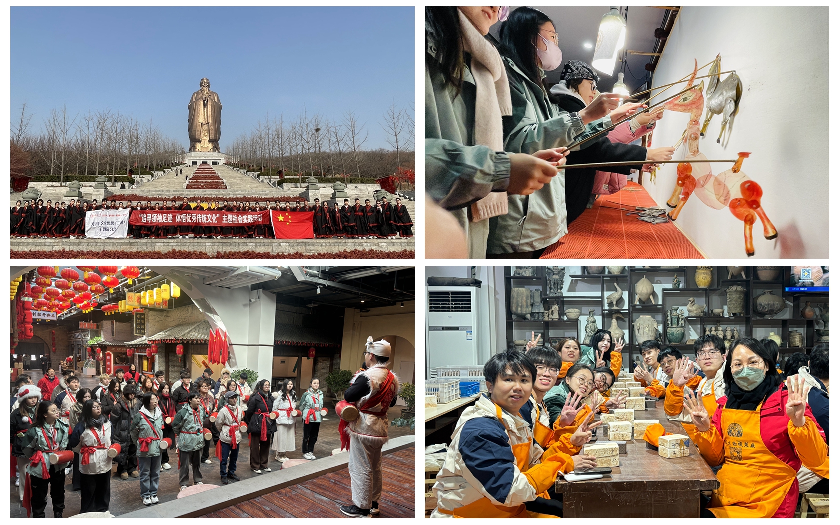 习近平文化思想主题研习营实践团队前往黄帝故里参加拜祖大典敬献五谷、行施拜礼、恭读拜文、祈福中华,体悟古人尊祖重孝、崇尚礼仪文化精神;在山东曲阜尼山,实践队员着学子服,拜行揖礼,漫步贤廊,品鉴食礼,手读论语,韦编三绝,搭弓射箭……沉浸式地体验了“仁义礼智信”的内涵;在陕西西安,实践队员身着唐装漫步长安十二时辰主题街区,在可知、可感、可触摸、可品鉴的唐文化体验中,沉浸式感受大唐风韵,感受别样春节;实践导师结合河南发展历史故事,为同学们生动讲述过去河南人民发展不易与生活艰辛,教育同学们珍惜粮食、心怀感恩。