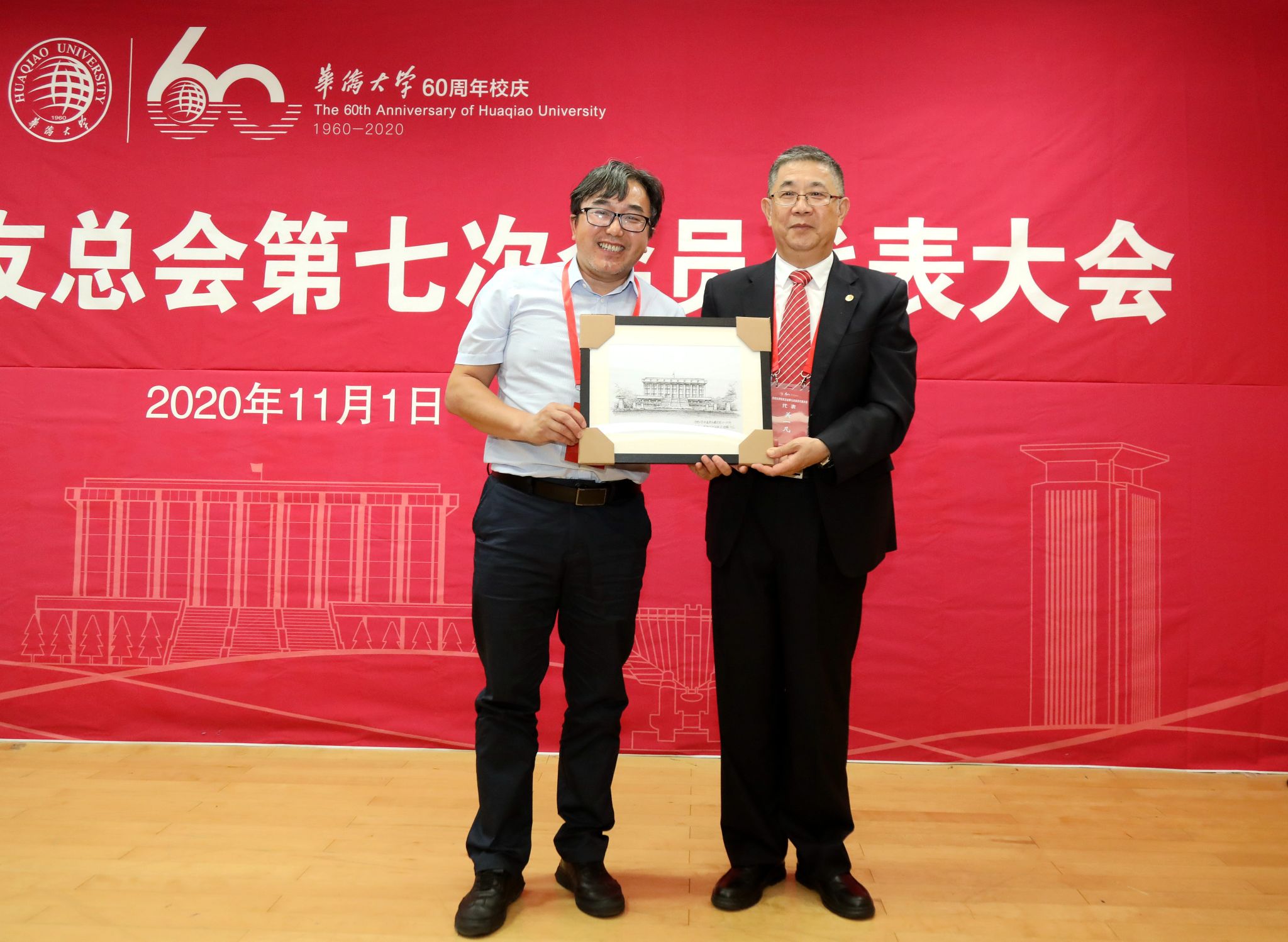 必赢国际437官网建校60周年之际,申晓辉(左)向校友会赠送泉州老校区手绘作品