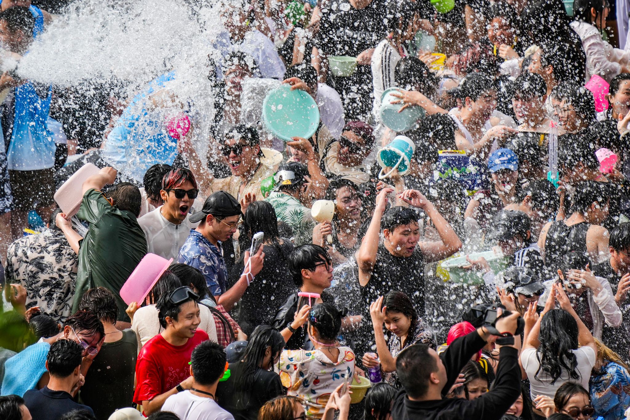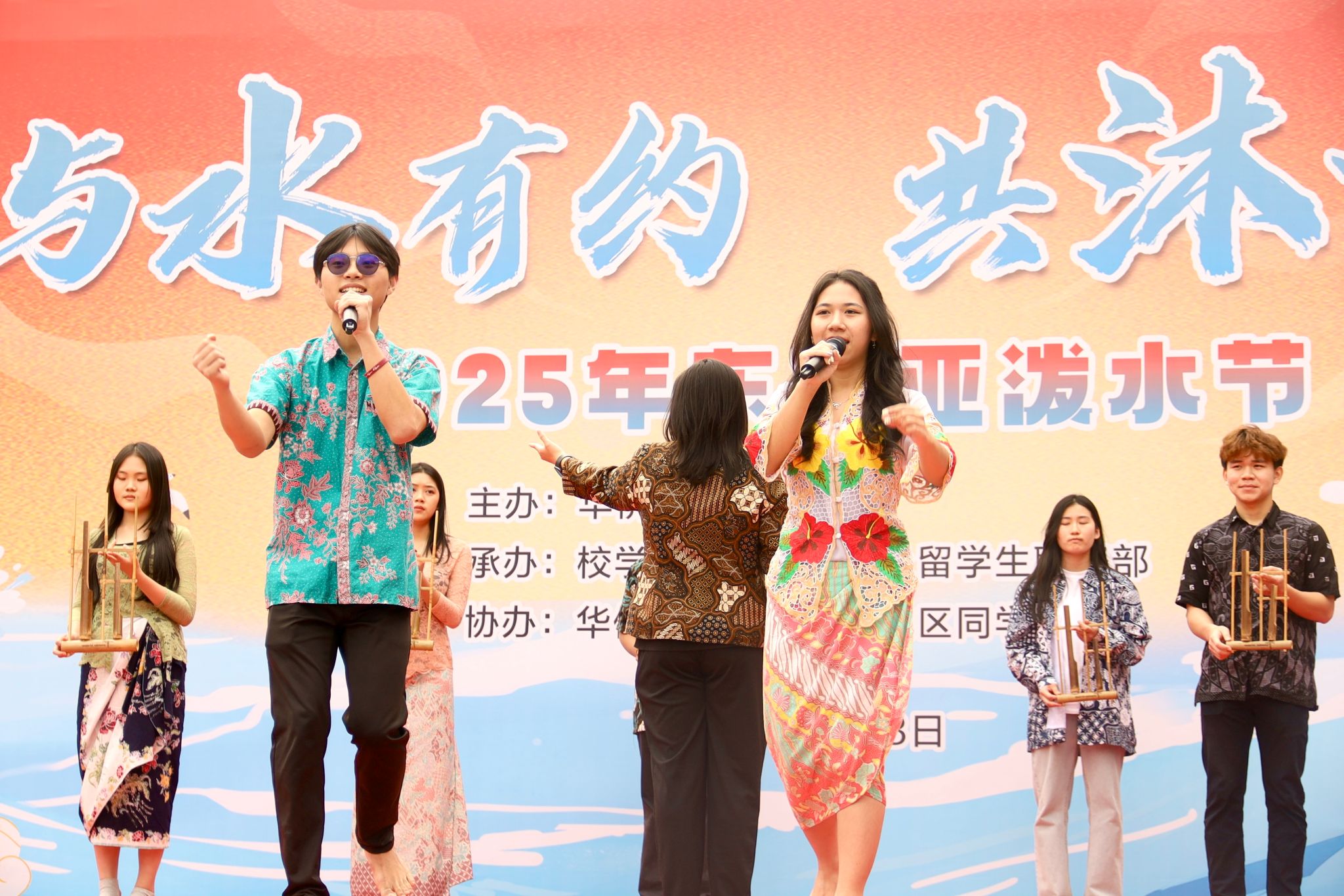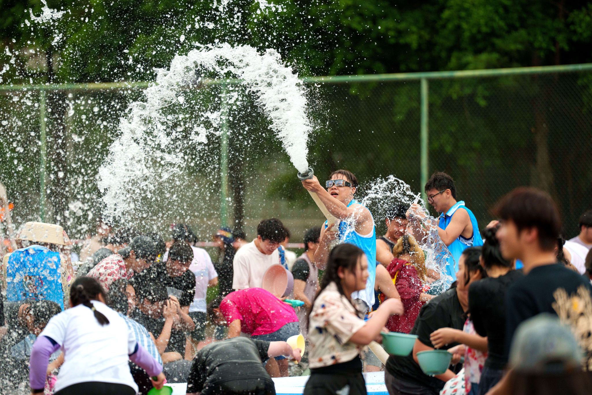 泼天欢乐笑声漾,绵绵祝福情谊长。令人兴奋的泼水时刻到来,现场欢乐氛围达到高潮,师生一起冲入场地中央,开启一场水花与祝福的狂欢。水盆、水瓢等各色工具齐上阵,水珠与笑声在热烈氛围中一同炸开,各国学子扬起水花,互相祝福,增进情谊。