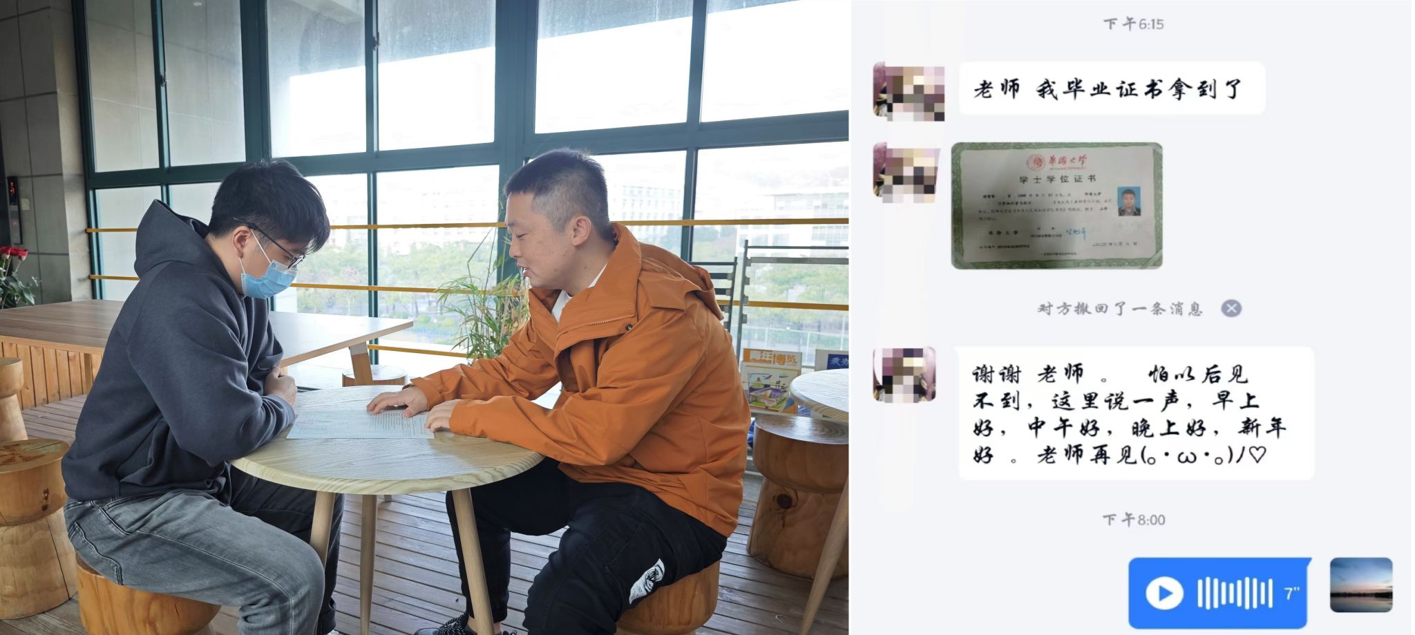 “老师,我真的很难受。”一天凌晨四点,一通电话打破了夜的寂静。电话来自一名2023届的延毕学生,该生患有严重心理疾病,曾因病情休学两次,并有过轻生行为。今年是该生延毕的最后一年。杜鹏程接手这个年级后,第一时间了解了其情况,并开始长达三年的持续陪伴与帮扶。从最初的抗拒交流,到如今的主动求助,杜鹏程用无数次的耐心谈话与默默陪伴,换来了这位学生的心理稳定与学业进步。如今,该生不仅即将顺利毕业,还计划留在大陆继续深造,对学校和老师的帮助充满感激。