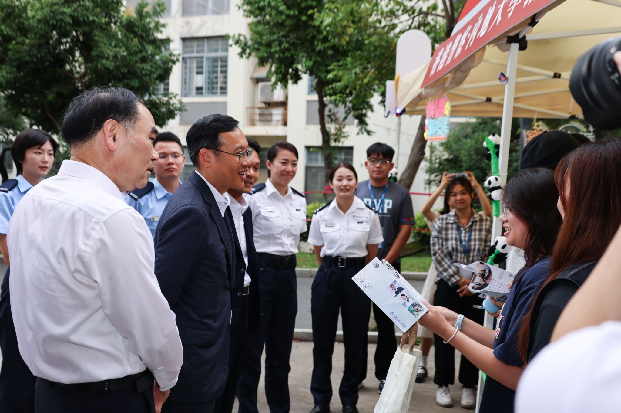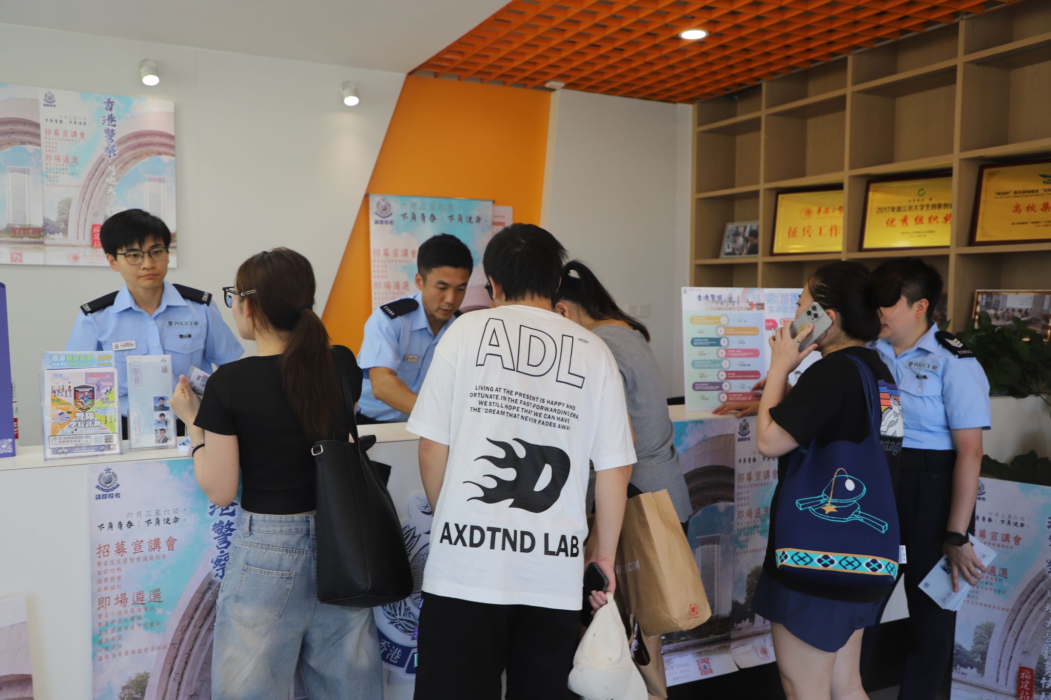 香港警务处副处长陈俊燊在招募宣讲摊位和同学们交流(叶盈盈/摄)