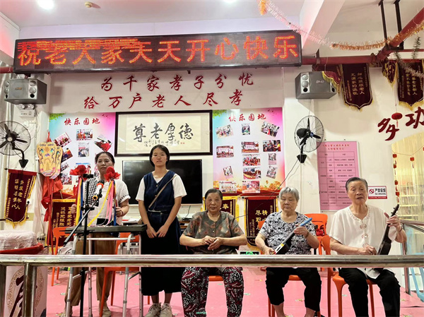 当日上午10点,《欢聚一堂》的喜庆乐声在琅岐星光锦苑养老院奏响,擂鼓激昂、弹唱热烈,合成器多样的模拟音声穿插其间,迎合着老人们的笑容,为这场关怀慰问活动锦上添花。“我今年九十几岁了,今天能看到这么多年轻人来看我,很高兴。”养老院的陈奶奶乐呵呵地用福州话说。