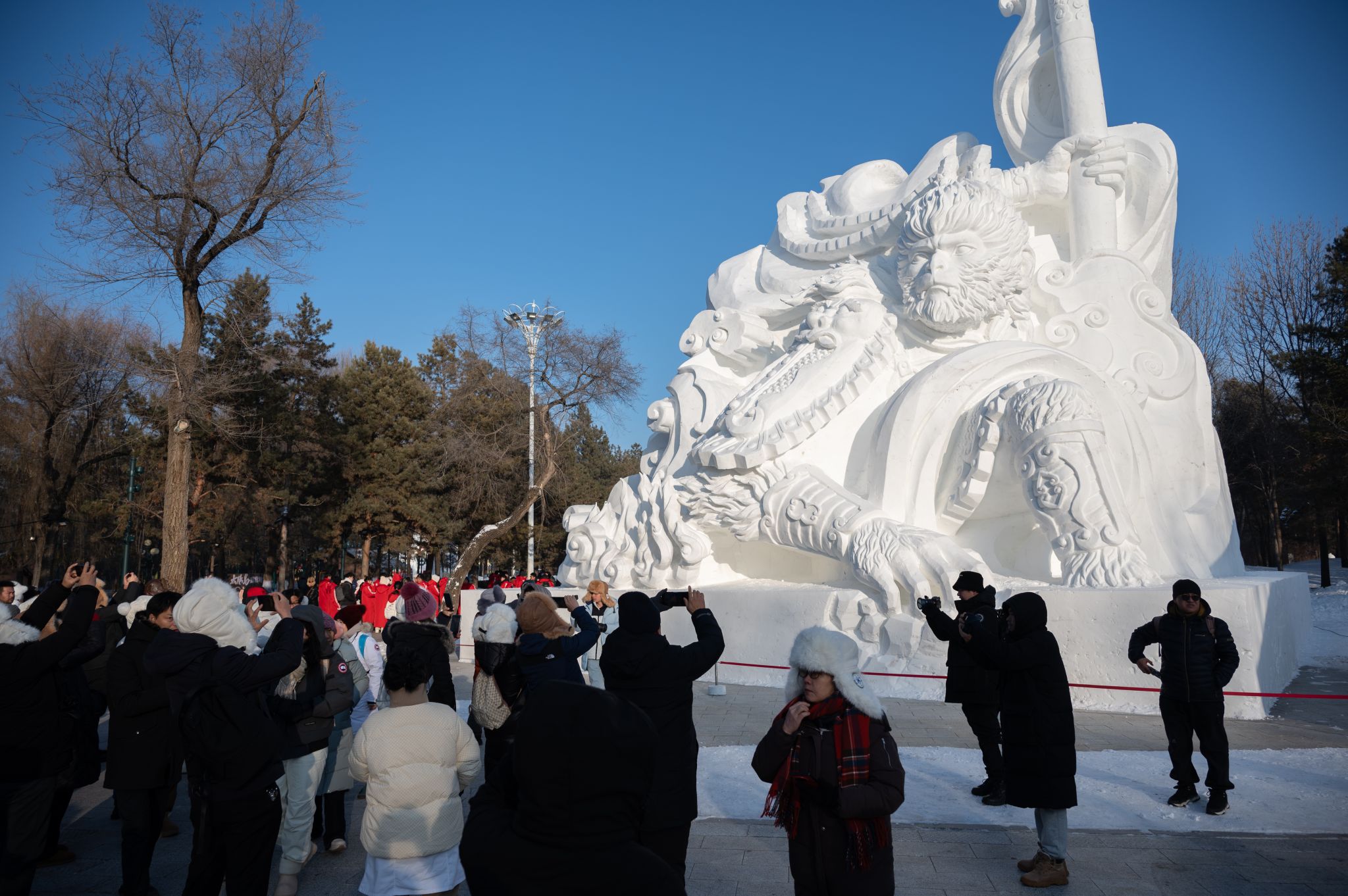在哈尔滨太阳岛雪博会,今年的核心雪雕作品《悟空归来》前围满了游客。雪雕师们将悟空的坚毅与霸气刻画得淋漓尽致。悟空身披的战甲、飞扬的毛发,通过精湛的技法被惟妙惟肖呈现。“太震撼了!没想到用雪能雕出这么宏伟的作品。”来自韩国的视频博主朴大一站在《悟空归来》旁,用无人机拍摄这动人心魄的作品。朴大一说,冰雪赋予哈尔滨独特的气质,希望世界各地的游客都能来到哈尔滨,感受冰雪带来的美好。