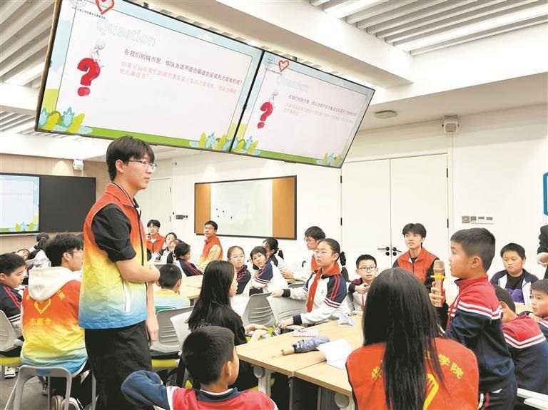 科普课堂上,志愿者向我们介绍了风力发电机的原理,使我们知道了风力发电不仅清洁环保,还能减少温室气体的排放。