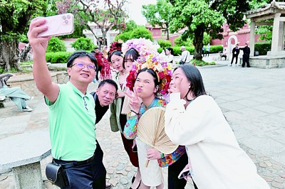 来自海峡两岸的女青年在体验蟳埔簪花围。胡勇摄/光明图片