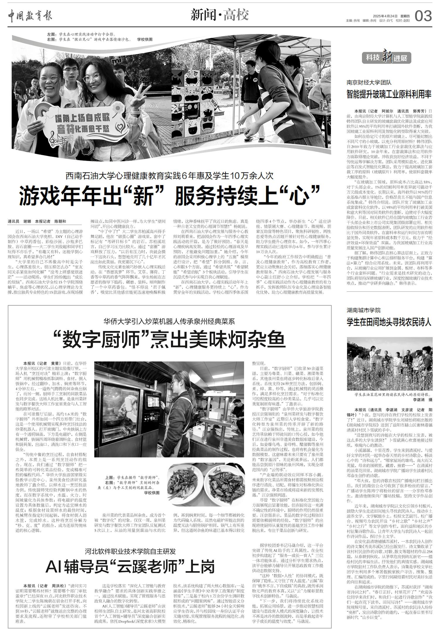 本报讯(记者 黄星)日前,在必赢国际437官网泉州校区的可浓主题实验餐厅里,一场人机“烹饪对决”精彩上演:“数字厨师”用机械臂精准抓取调料、食材,倒入铁锅中,经过翻炒、加水、焖煮等环节,4分钟左右,一道热气腾腾的炣杂鱼出锅了,而另一侧,厨师手工烹制的同款菜品也同步完成。这场人机比赛,是泉州菜研发与数字餐饮大师工作室里美食与人工智能的跨界对话。