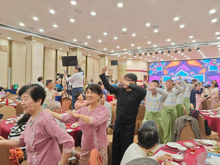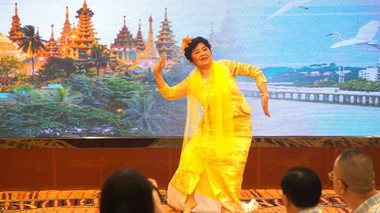 活动接近尾声时,一曲缅甸传统歌舞《瓦城的花朵》将现场的气氛推向了高潮。伴随着欢快的旋律和轻快的舞姿,演员纷纷走下舞台,与在场胞波们热情互动,大家载歌载舞,互泼吉祥香水,观众们被这突如其来的惊喜深深吸引,他们纷纷起立,鼓掌欢呼,迎接着演员们的到来。演员们热情地邀请观众加入到载歌载舞的队伍中,一起感受这份来自缅甸的热情与欢乐。会场里欢乐氛围展现得淋漓尽致,仿佛置身于泼水节的现场,感受着泼水节的那份欢乐与祥和。
