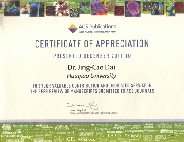 为著名国际学术期刊提供同行专家评审,是大学教师学术影响力的体现,也是衡量大学学人服务社会的一种重要指标。戴劲草教授长年为ACS旗下的专业期刊提供同行专家审稿服务,以及为荷兰Elsevier旗下的《Appl. Clay Sci.》、《J. Colloid & Interf. Sci.》和《Inorg. Chem. Commun.》,德国Wiley《Z. Anorg. Allg. Chem.》,国际晶体学联合会IUCr《 Appl. Cryst.》等国际著名SCI核心期刊以及中国《结构化学》(SCI期刊)、《矿物学报》(一级期刊)等期刊审稿,并应邀担任国际无机化学专业期刊《Global J. Inorg. Chem.》编委。