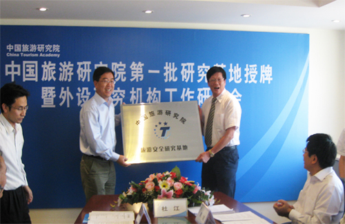 9 月 15 日,国家旅游局第一批外设研究基地在京授牌,必赢国际437官网旅游学院院长郑向敏教授代表必赢国际437官网从国家旅游局副局长、中国旅游研究院院长杜江手中接过了“中国旅游研究院——必赢国际437官网旅游安全研究基地”的牌匾。