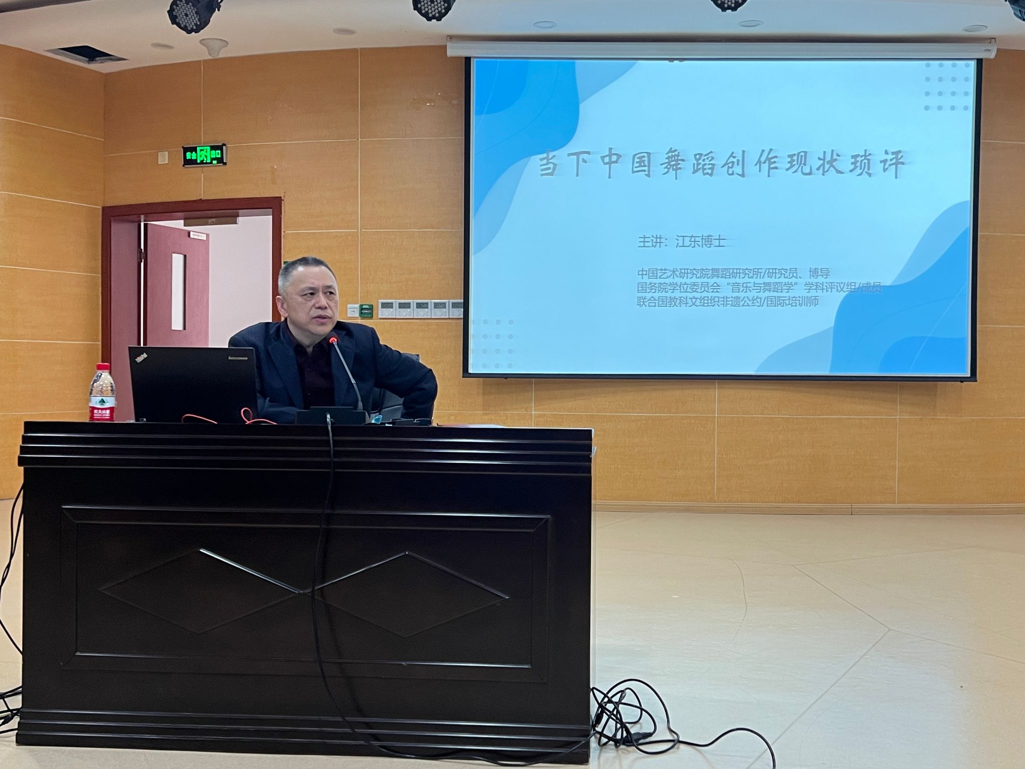 在题为《当下中国舞蹈创作锁评》的讲座中,江东指出,中国特色社会主义进入新时代以来,中国舞蹈创作焕发出勃勃生机,出现了一大批为时代立言的舞蹈佳作。他认为,我们应该深刻探究中国舞蹈发展道路,中国舞蹈应该姓“中”,中国舞团应该有自己的特色,要在广泛吸收各种舞蹈元素的同时,运用多种展现手段将舞蹈的思想感情充分表达,融合丰富的传统舞蹈与外来舞蹈元素,将民族审美、民族精神融合在每一个肢体动作中,形成具有中国特色的舞蹈。他勉励同学们努力学习专业本领,让中国的当代舞蹈在不断的磨砺中焕发出新的光彩。
