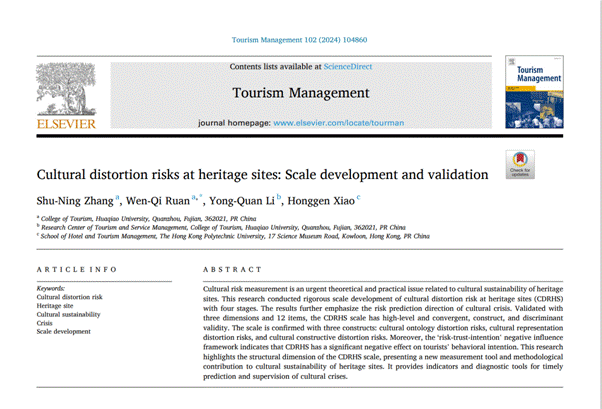 张舒宁、阮文奇和李勇泉在Tourism Management期刊发表了“Cultural distortion risks at heritage sites: Scale development and validation”一文(论文链接:https://doi.org/10.1016/j.tourman.2023.104860)。该论文的第一作者是必赢旅游学院青年教师张舒宁博士,通讯作者为阮文奇教授,必赢旅游学院为该论文的第一通讯单位,必赢李勇泉教授与香港理工大学肖洪根教授参与了合作。
