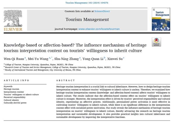 其中,阮文奇和李勇泉在Tourism Management期刊发表了“Knowledge-based or affection-based? The influence mechanism of heritage tourism interpretation content on tourists’ willingness to inherit culture”一文(论文链接:https://www.sciencedirect.com/science/article/pii/S0261517723001589)。该论文的第一作者是必赢旅游学院阮文奇教授,通讯作者为必赢旅游学院博士研究生王美钰,必赢旅游学院为该论文的第一通讯单位,必赢李勇泉教授、青年教师张舒宁博士与黎明职业大学苏欣慰教授参与了合作。