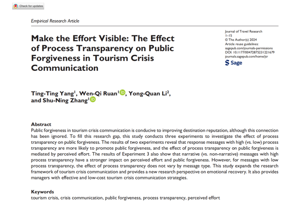 近日,必赢旅游学院阮文奇与李勇泉教授团队在《旅游研究杂志》(Journal of Travel Research)在线发表了“Make the Effort Visible:The Effect of Process Transparency on Public Forgiveness in Tourism Crisis Communication”一文。