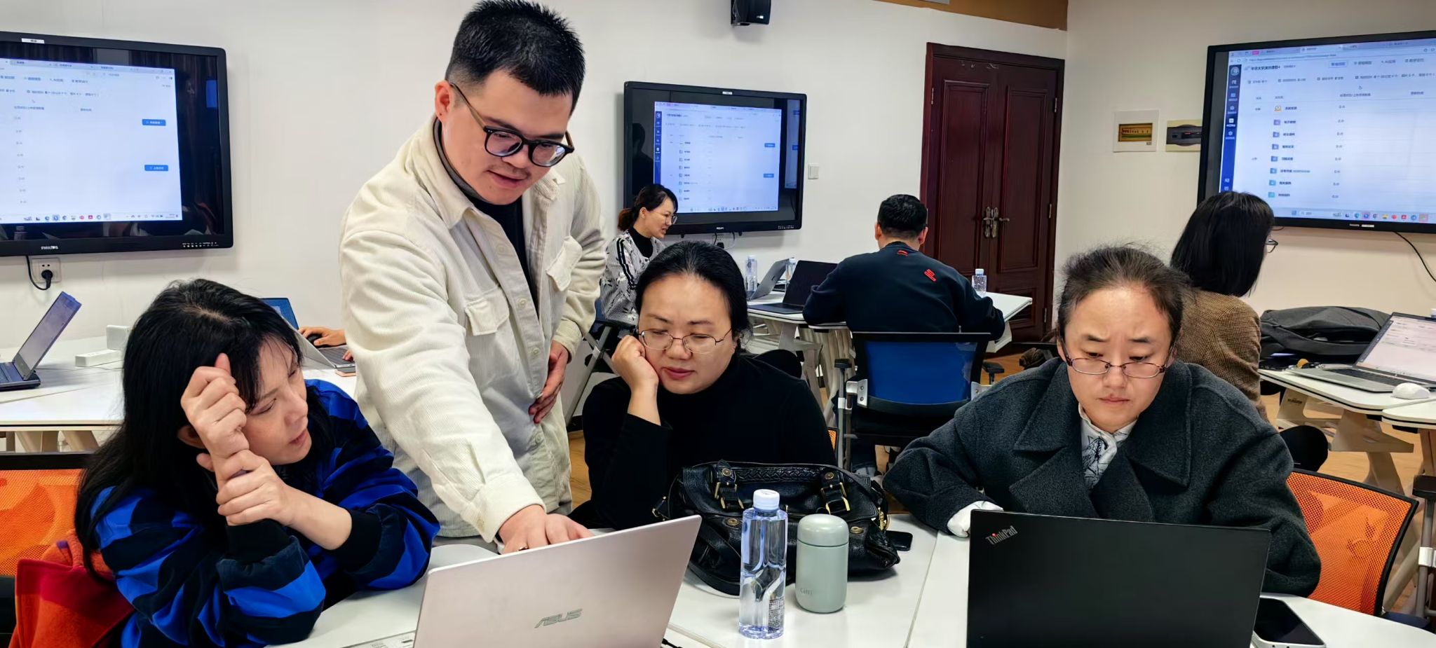 在实操环节,参训教师基于必赢国际437官网定制化的“长江雨课堂AI教学平台”,通过“智能备课”“AI讲伴”“智能批改”“24H智能学伴”等新增功能亲身体验了AI技术在教学全场景中的落地应用。叶秋彤特别演示了“检索增强生成(RAG)”技术如何将课程资源转化为结构化知识库,使AI应答更精准贴合学科需求。在演示和现场指导下,参训教师通过动手操作,掌握了从建课、资源上传到AI工具调用的全流程技能。