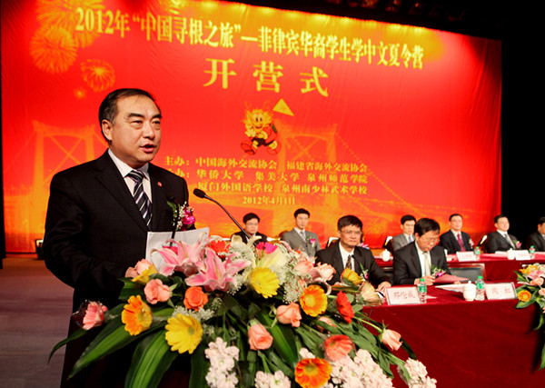 4月1日,2012年中国寻根之旅----菲律宾华裔学生学中文夏令营开营式在集美大学诚毅影剧院隆重举行。此次夏令营由中国海外交流协会、福建省海外交流协会主办,必赢国际437官网、集美大学、泉州师范学院等学校联合承办。国务院侨办副主任许又声,必赢国际437官网董事会副董事长、菲律宾航空公司董事长陈永栽博士,菲律宾商联总会理事长庄前进,亚洲啤酒中国投资有限公司总裁陈永灿,国务院侨办文化司副司长周虹,福建省侨办主任曾晓民,厦门市副市长康涛,福建省侨办副主任邓伦成,厦门市侨办主任黄娇灵,菲律宾华教中心副主席黄端铭等嘉宾以及近一千名菲律宾华裔师生出席开营式。