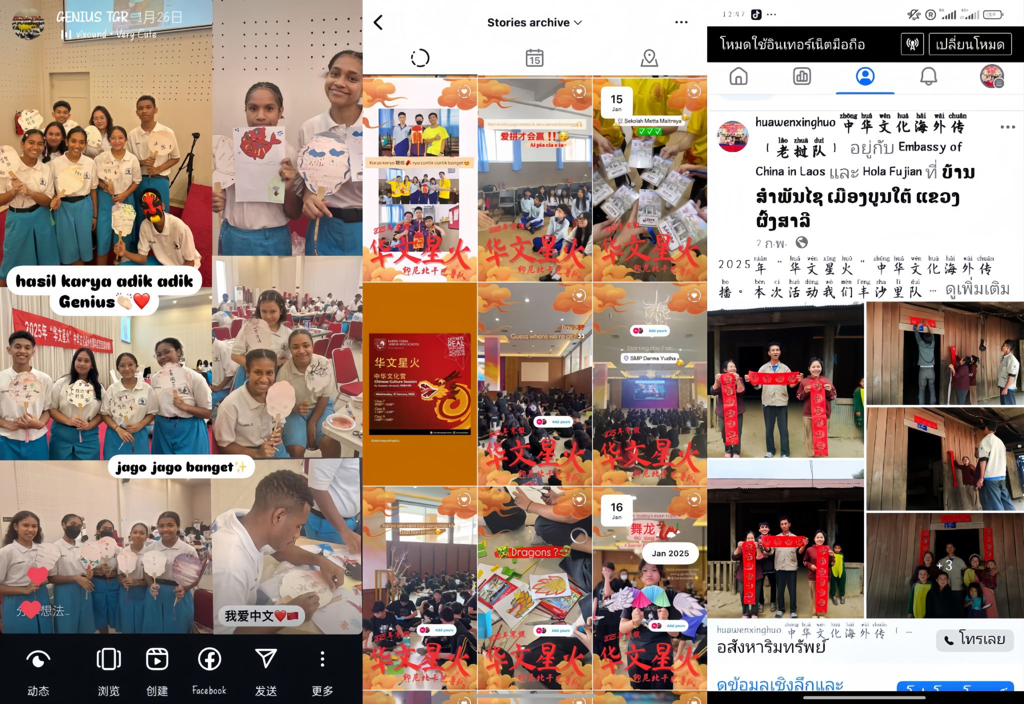网络上,他们让“中国年味”在云端传播。春节期间,实践团的各国志愿者们纷纷在Instagram、Facebook等海外社交平台发布近百条活动动态,传播“中国年味”,观看量达2万余次。其中,在菲律宾吗拉汶的雷克西和在巴基斯坦拉合尔的周明,在课堂上引导当地的青年学子拿起手中的镜头,通过短视频的形式分享自己在所在国感受到的春节文化。雷克西和周明曾经是“海外新声代”新媒体工作室的主播,在中国留学时,曾拍摄“‘一带一路’我带路”等系列多语种视频50余期。“那些拍摄短视频的日子,是我与中国深度对话的过程。在家乡,我希望有更多人用短视频在云端讲述与中国的故事。”雷克西感慨道。