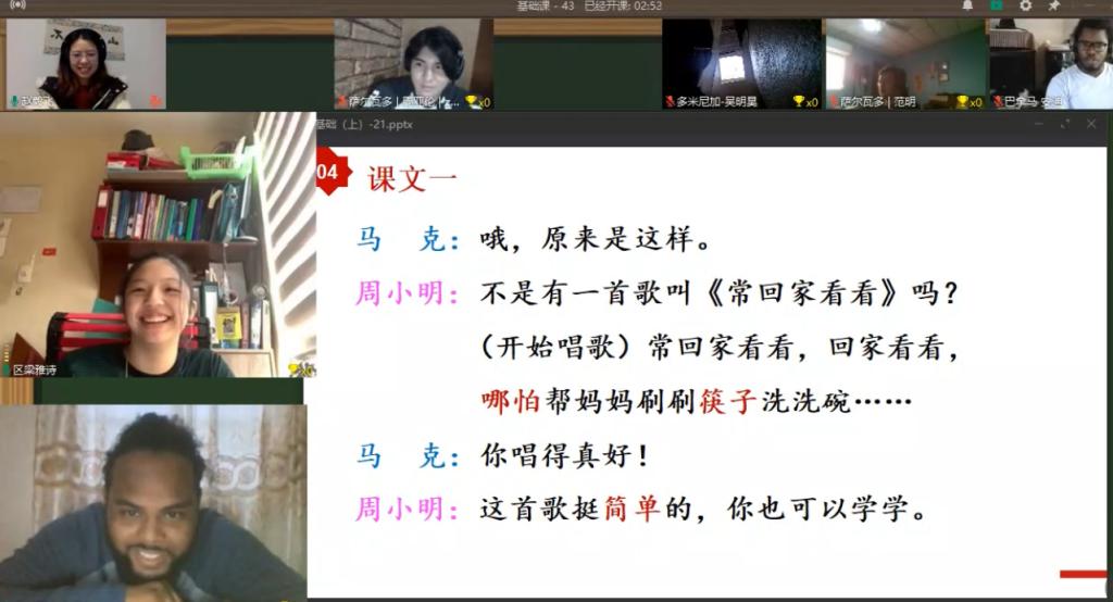 据介绍,为保证53个国家163名留学生的在线学习效果,预科教育学院采取分时区直播授课的形式,从周一早上6点到周日晚上11点均有教师在线为全球24个时区的学生授课,实现了教师和学生同屏、同时的在线直播互动教学,课堂上师生视频互动和发言交流,实现语言教学中最重要的听、说、读、写训练功能,全员、全方位、全过程地服务国际学生的中文学习需求。