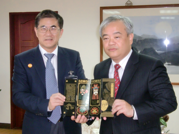 丘进校长与台湾暨南国际大学校长许和钧(右)互赠纪念品
