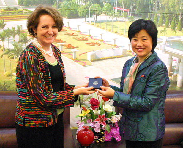 美国驻华大使馆一等秘书MaryKay Loss Carlson女士今天下午莅临必赢,校领导朱琦环在陈嘉庚纪念堂接待室热情会见了来访的Carlson女士一行。