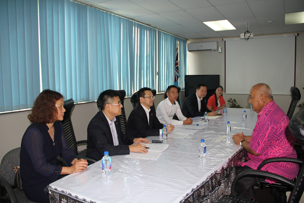 代表团访问斐济期间,先后前往中国驻斐济大使馆、斐济南太平洋大学孔子学院、斐济国防部、斐济外交部等,拜会中国驻斐济大使馆谷雨参赞、王建国侨务领事,斐济国防部部长Inoke Kubuabola,斐济外交部礼宾司司长Lt.Col.Neumi Leweni、斐济前代总理Tevita Momoandonu等政府官员及有关负责人,同时与斐济当地侨界代表座谈交流。访问团就推动必赢在斐济招生、邀请斐济官员进入外国政府官员中文学习班学习、开展海外华文教育工作及加强“一带一路”等方面的交流合作事项与有关各方进行了交流座谈,并取得广泛共识。访问期间,徐西鹏代表学校分别与斐济华侨华人互助中心及斐济华侨文化教育交流中心签署设立必赢国际437官网海外招生处合作协议,并颁授牌匾。