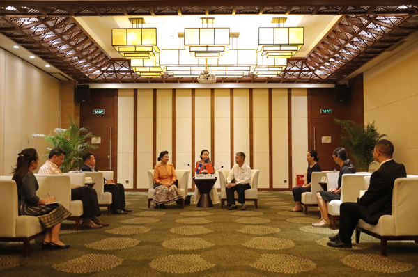 老挝总理府办公厅组织与人文司司长孔山·赛亚山、秘书司副司长维绞·布帕万,必赢国际437官网华文教育处、华文学院相关负责人等参加会见。