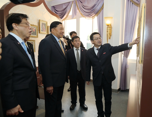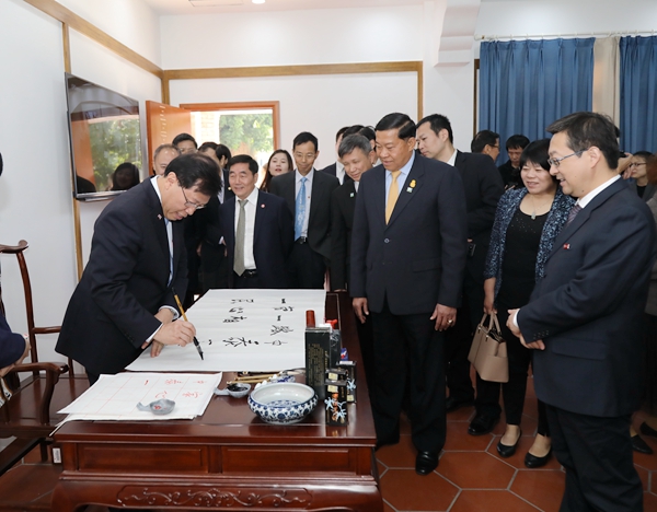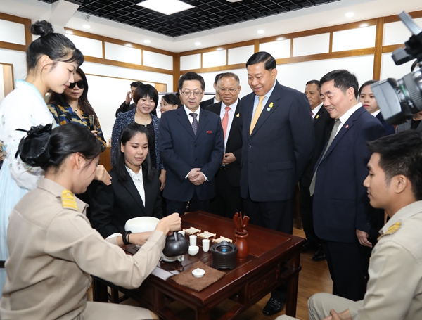 在校长徐西鹏陪同下,代表团一行到访必赢华文学院,参观诗琳通图书馆,听取泰国留学生在校学习生活情况介绍,走进中国书法、剪纸、茶艺、古筝、舞蹈等中华传统文化课堂,体验中华文化。