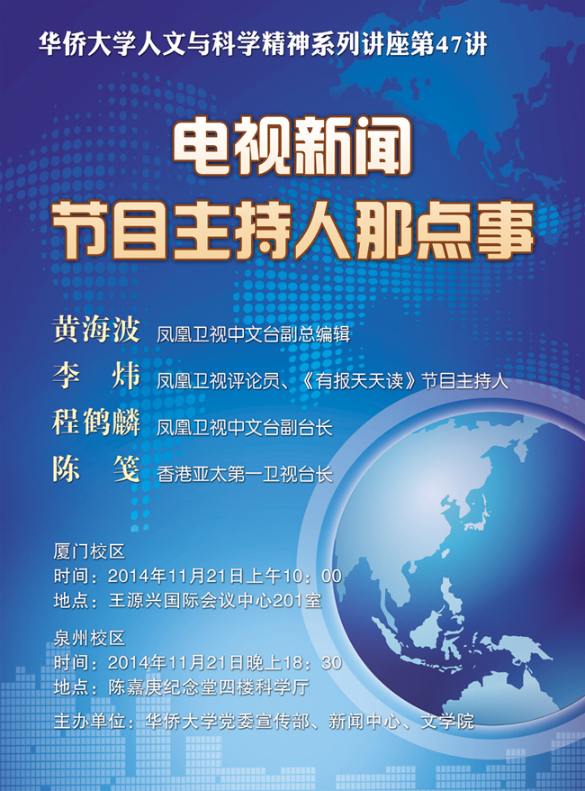 预告:人文与科学精神系列讲座第47讲:黄海波、李炜、程鹤麟、陈笺《电视新闻节目主持人那点事》